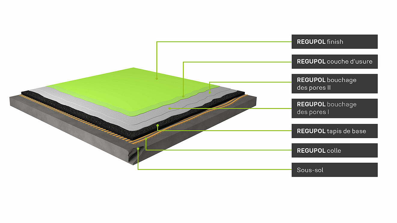 Choisissez l'épaisseur et le degré d'élasticité de notre tapis de base REGUPOL en fonction de l'élasticité souhaitée et de l'absorption des forces nécessaire pour votre application en salle. Nous préfabriquons ces tapis dans des épaisseurs de quatre à douze millimètres pour nos revêtements sportifs.