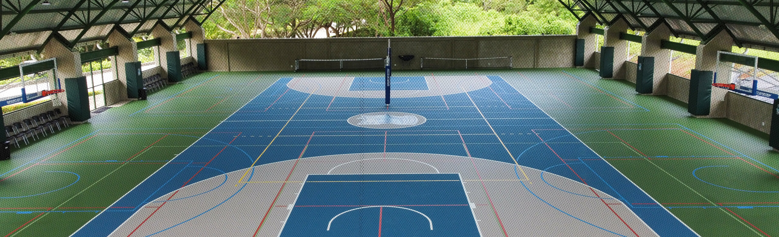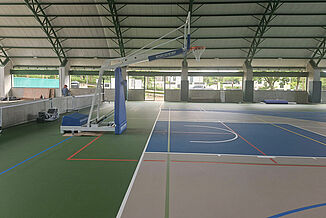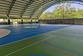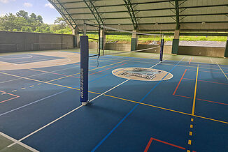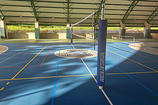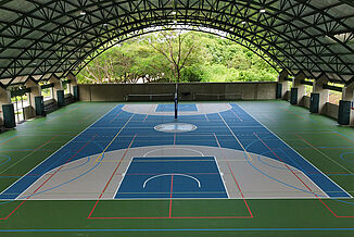 Afin d'ancrer également ces critères durables dans le domaine du sport, l'établissement La Paz Community School a fait appel à REGUPOL. En Amérique latine, il est habituel de construire des gymnases « semi-ouverts ». Cela signifie qu'ils ne présentent souvent pas de murs extérieurs continus, mais un vaste toit en surplomb. Toutefois, en cas de conditions météorologiques extrêmes, l'humidité peut tout de même affecter le sol. 1062 m² de notre système de sol REGUPOL dynamic classic 8+2 ont été utilisés ici, car ce matériau - contrairement au bois, au PVC, au linoléum ou à d'autres matériaux similaires - résiste aux intempéries. En outre, le sol se distingue par de nombreux avantages : il est très durable, antidérapant, a une fonction de protection élevée pour les sportifs et un bon comportement de rebond du ballon. Grâce à une couche d'usure en polyuréthane sans joint, ce sol est aussi extrêmement facile à nettoyer et à entretenir.