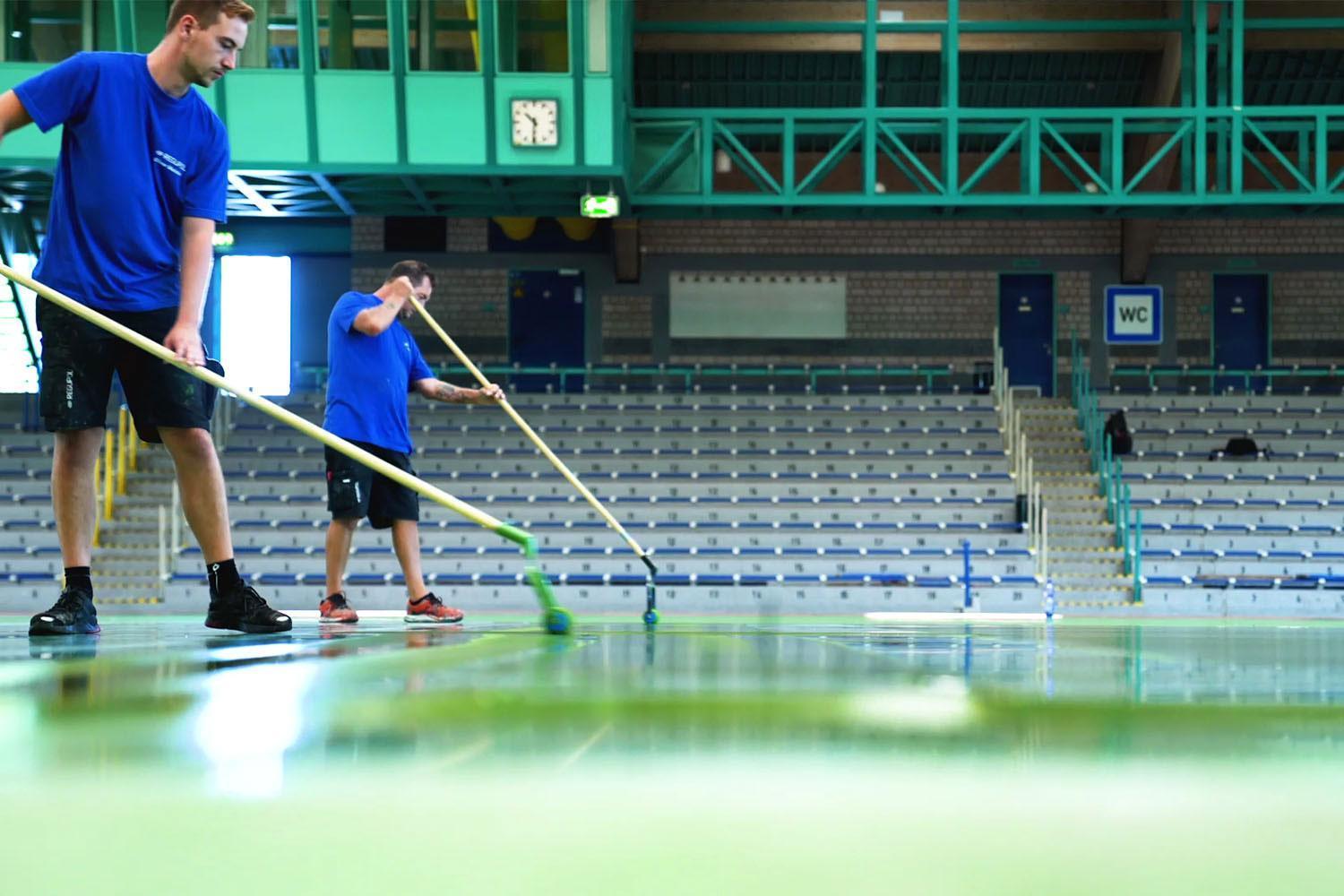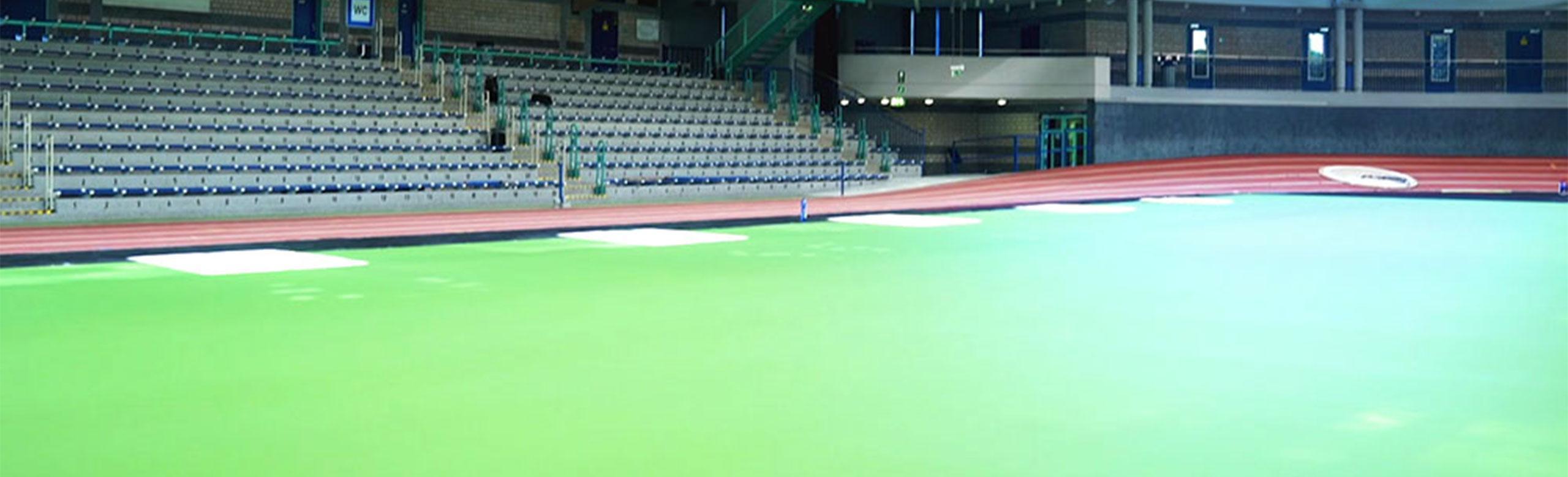 Comme les athlètes portent également des chaussures à crampons lors des entraînements en salle, l'ensemble du revêtement de la salle de sport devait être conçu de manière à résister aux crampons. Cette exigence ne pouvait pas être remplie par un revêtement de salle de sport normal, car les crampons détruisent les surfaces des revêtements traditionnels.