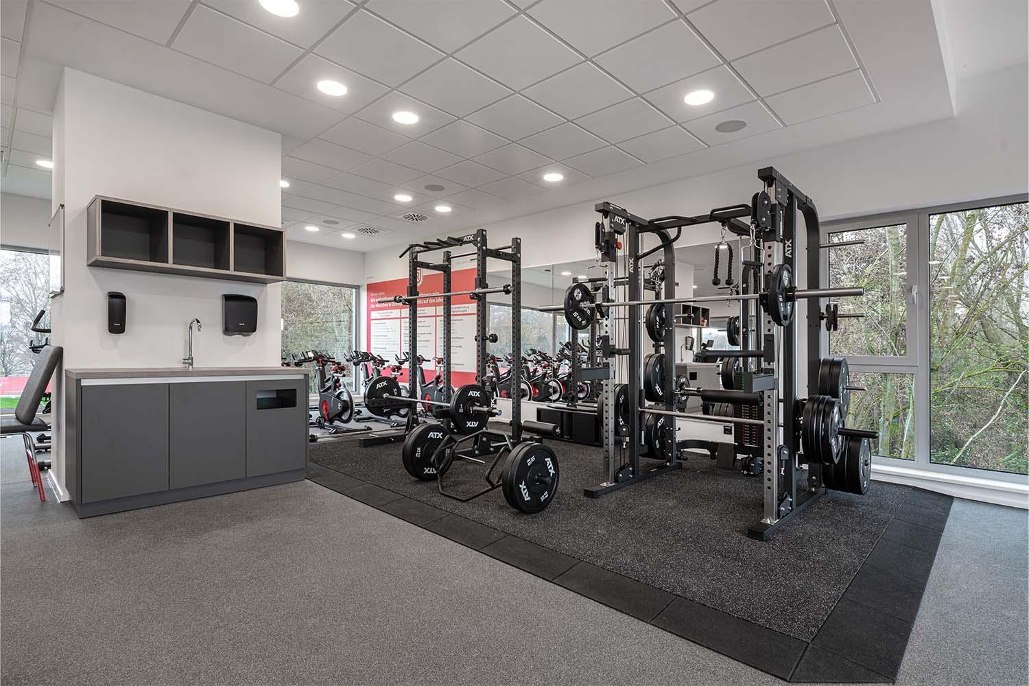 Grâce à REGUPOL sonusfit c-series, il est possible de réaliser des interviews et de travailler en toute sérénité tandis que les joueurs peuvent se détendre dans l'espace de kinésithérapie. Ce revêtement de sol est posé sur une chape désolidarisée et présente une faible fréquence de résonance. Il atténue ainsi efficacement les bruits gênants, causés par la chute de poids ou la réalisation de sprints dans le centre de remise en forme, même à des fréquences basses. Adaptée aux besoins du client, la solution fournie satisfait les différentes exigences de l'espace de cardio et de musculation avec des haltères. Le revêtement de sol de l'espace de musculation avec des haltères a été complété par REGUPOL sonusfit m-series 517, ce qui réduit encore davantage les nuisances sonores. En raison d'exigences différentes, le revêtement REGUPOL everroll impact a été posé dans l'espace de sprint et cardio. L'association d'une chape adaptée aux fréquences basses et des revêtements utilisés permet une coexistence harmonieuse des différentes zones du bâtiment.